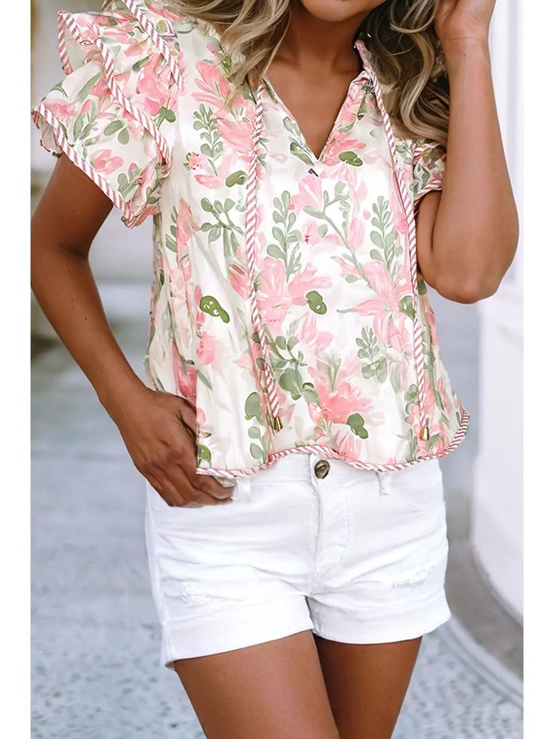 Introducing the Flora Top, a vibrant addition to your wardrobe that embodies the essence of summer. This stylish top features a delightful floral print in soft pinks and greens, perfect for adding a touch of nature-inspired charm to any outfit. The ruffled sleeves offer a playful flair while the relaxed fit ensures comfort throughout the day.